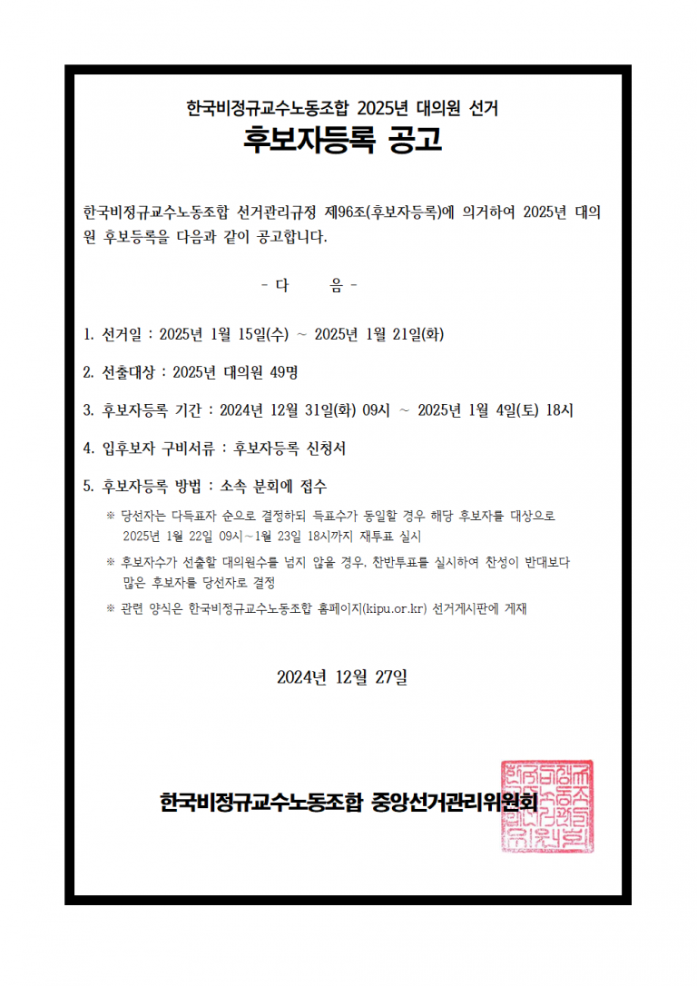 한국비정규교수노조 2025년 대의원 선거 후보자 등록 공고 페이지 정보 작성자 관리자 작성일24-12-31 11:45 조회3,107회 댓글0건 이전글 다음글 목록 본문 추천 0 댓글목록 등록된 댓글이 없습니다. 이전글 다음글 목록