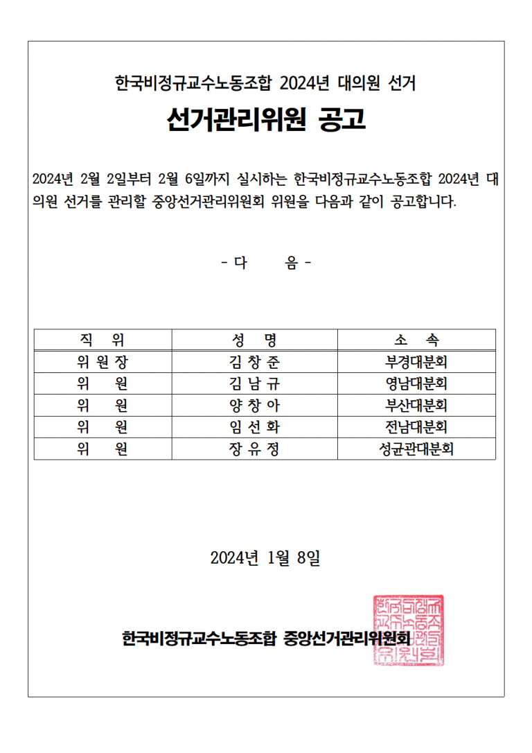 한국비정규교수노조 2024년 대의원 선거 선거관리위원 공고 페이지 정보 작성자 관리자 작성일24-01-10 16:56 조회5,134회 댓글0건 이전글 다음글 목록 본문 추천 0 댓글목록 등록된 댓글이 없습니다. 이전글 다음글 목록