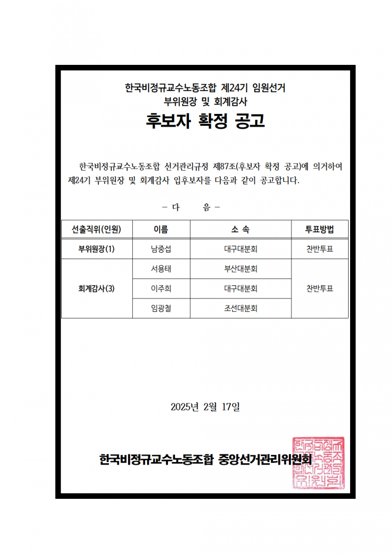 한국비정규교수노조 제24기 부위원장 및 회계감사 후보자 확정 공고 페이지 정보 작성자 관리자 작성일25-02-18 11:45 조회2,408회 댓글0건 이전글 다음글 목록 본문 추천 0 댓글목록 등록된 댓글이 없습니다. 이전글 다음글 목록